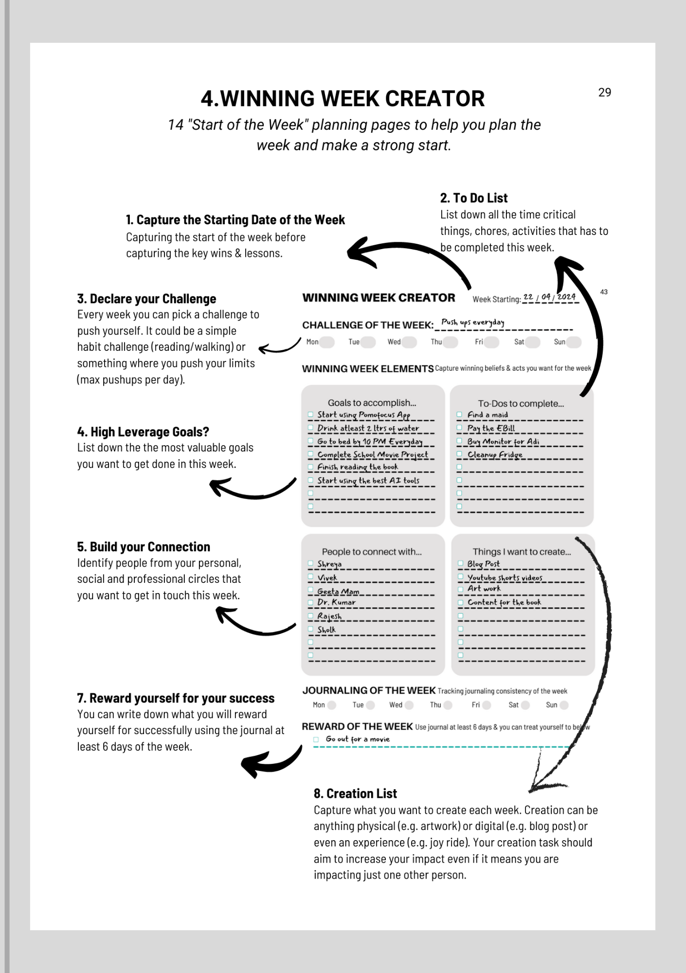 Make the most of each week by starting the week by identifying key elements of a winning week and ending it by reviewing the wins and lessons accumulated.